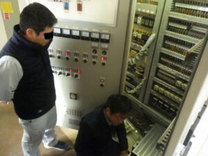 実際の制御盤を使い、電気の流れ、用途や仕組みを教えて頂いたり